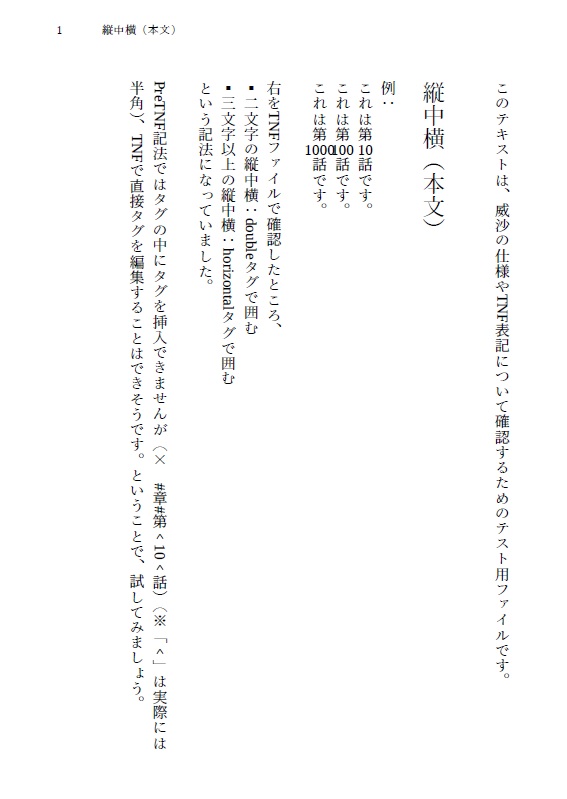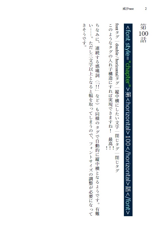 威沙で章タイトルを縦中横にしたい、という記事も見付けたのですが、紹介されている方法では意図した結果にならなかったので(仕様の変更によるものか?)、自分なりの解決策を紹介しておきます。以下のページは実際に威沙で作成してみました。